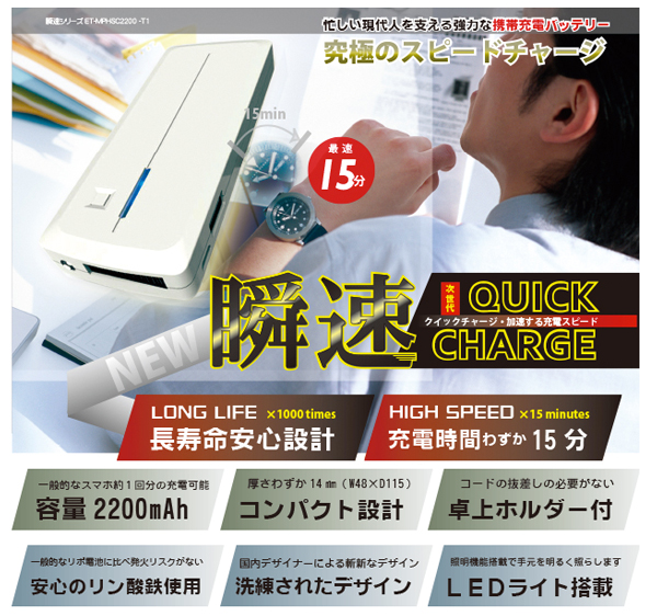初回機種「瞬速2200」は、容量2200mAhのモバイルバッテリー。専用ホルダー(セット販売)を使用すればわずか15分で充電することが可能で、スマートフォン型であればほぼ1回、フィーチャーフォン型なら2回分の充電が行える。マイクロUSB充電口から従来のチャージャーでも充電が可能なので、旅先への携帯にも最適だ。重量は97g、厚さ14mmの軽量・コンパクトなボディを実現している。カラーはホワイトのみ。