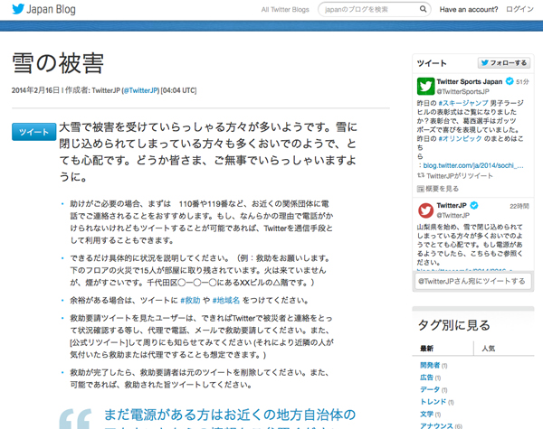 Twitterが2014年2月16日(日)に、大雪の被害で救助が必要な場合のTwitter利用法について公式ブログで案内している。記事によると、助けが必要な場合はまず110番や119番など、近くの関係団体に電話で連絡することをすすめているが、もし何らかの理由で電話がかからないが、ツイートすることが可能な場合は、Twitterを通信手段として利用することもできるとしている。