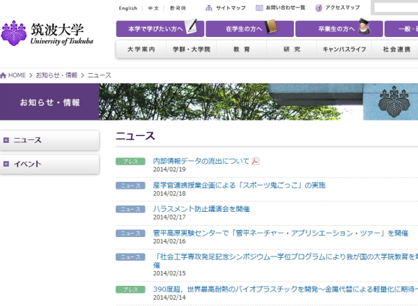 筑波大学、ストレージに適切なアクセス制限をかけずに学生などの個人情報流出