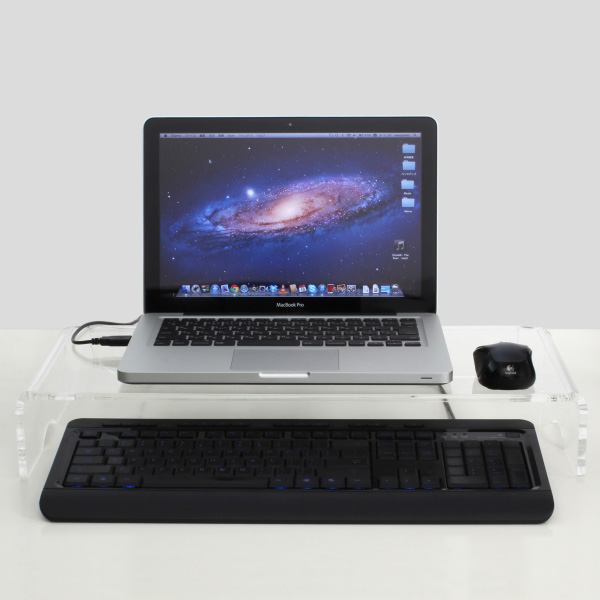 本製品は、透明で圧迫感がないモニタースタンドだ。スタンド下部にキーボードを収納できるなど、スペースの有効活用にも配慮されたモデル。製品には滑り止めのシールが4枚付属し、安定した設置を実現することができる。本体サイズは547(幅)×90(高さ)×270(奥行)mmで、アクリルの厚さは8mm。