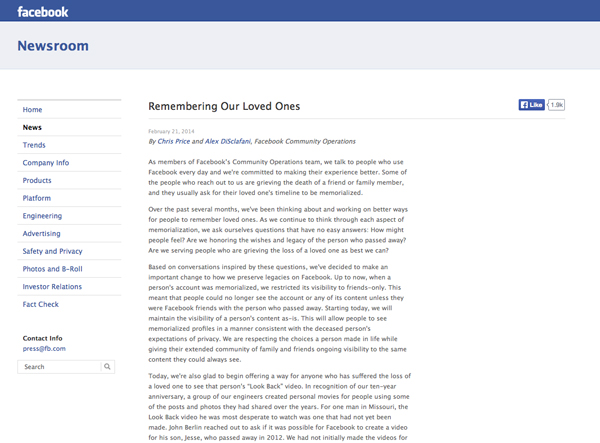 Facebookは、亡くなったユーザーが利用していたアカウントの公開範囲設定を、生前と同じにすると発表した。この「追悼アカウント」はユーザーが亡くなった場合に親族が申請すれば、該当するアカウントが「追悼アカウント」の扱いになり、写真や投稿などがそのままFacebookに保存されるもの。これまでは公開範囲が「友達」までだった。