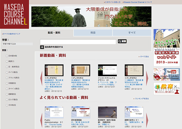 早稲田大学は、“教育の早稲田”を可視化するためのWebサイト「WASEDA COURSE CHANNEL」(URL:http://course-channel.waseda.jp/)をオープンした。2006年からの「早稲田大学 Open Course Ware」での教材の公開、2009年からの「早稲田大学 iTunes U」での講義映像の公開を集約し、2014年末には約1000本の講義映像を配信予定。その後も、順次公開コンテンツが追加される予定となっている。