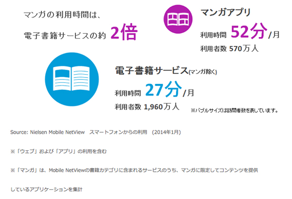 ニールセン株式会社は、スマートフォンにおける書籍・マンガサービスの利用状況を調査し、結果を発表した。調査によると2014年1月時点で、スマートフォンで書籍購入や書籍閲覧などの電子書籍サービスを利用している人は、2013年5月からの8か月間で670万人増加し2000万人を超えたという。