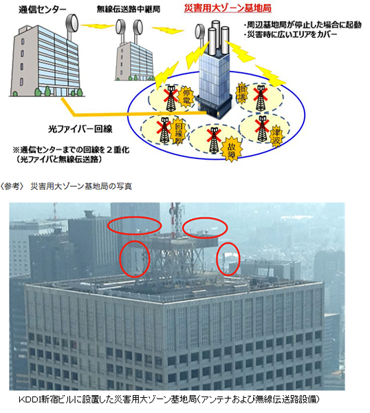 KDDI株式会社は、大規模災害が発生した場合でも音声通話やデータ通話など、携帯電話サービスの提供が継続できるよう、国内で初めて4G LTEに対応した「災害用大ゾーン基地局」を導入したと発表した。2013年4月より設置を開始し、2014年2月に首都圏エリアをカバーする全10局の設置が完了、運用をスタートしている。