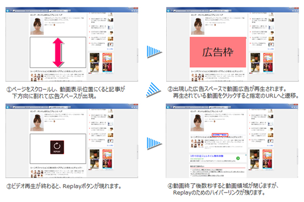 同サービスは、「All About」の記事内にて、広告主が保有するTVCMなどの動画コンテンツを表示する広告商品。初期状態では動画広告枠は非表示となっており、ユーザーが記事を閲覧しながら動画表示位置までスクロールすると、広告が出現して動画が再生される。広告の掲載先は、All Aboutの記事の中から編集部が選んで再編集した「All Aboutまとめコンテンツ」や、30~40代の男性向け「For M」、30~40代の女性向け「For F」などのライフスタイルWEBマガジン内となる。