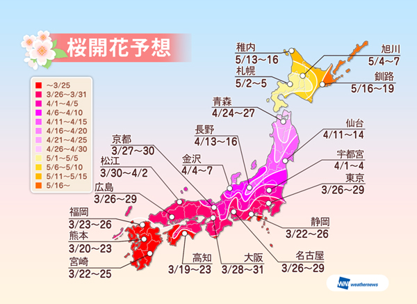 発表によると、昨年は3月に入って急激に気温が上昇したため、西〜東日本で非常に早く開花した。一方、今年は3月前半の気温が昨年より非常に低くなったため、昨年より遅めの開花となる見込みだとしている。また、北日本は昨年、開花直前の時期の気温低下で開花が遅くなったが今年は昨年ほどの冷え込みは無い予想で、昨年よりかなり早めに開花する予想だとしている。今年のソメイヨシノの最も早い桜の一輪開花は、3月半ば過ぎから九州・四国の沿岸部・紀伊半島南部で始まり西日本、東日本へと広がっていくとしているほか、都心周辺は3月下旬の後半に開花のピークを迎えそうだ。