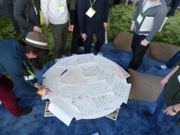 そしていよいよアイデアソン本番が開始。ここでは昨年と同様、未来志向の会議手法「視覚会議」を展開するNPO法人 アイデア創発コミュニティ推進機構の代表理事である矢吹博和氏が、ファシリテーターとなってアイデア出しを支援した。今年はISACのテーマとして、「地球観測」「宇宙技術」「有人飛行」「ロボティクス」「小惑星」という5ジャンル・40テーマが与えられているが、必ずしもこれらのテーマにこだわる必要はなく、自由な発想によるアイデアが求められている。