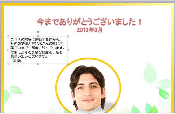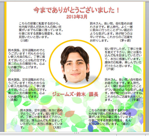 早いものです。3月の半ばを過ぎました。ここ数日気温も上がり、春がもうそこまで来ているように感じられます。そして3月と言えば、出会いと別れの季節です。そこで本日は、歓送迎会や卒業式などの寄せ書きを、Powerpointできれいにデザインする方法を紹介したいと思います。例えば、仲間がみんな忙しくて、色紙を回して手書きのコメントを集めるのが難しい場合、メールなどであらかじめメッセージを集めておけば、今回ご紹介する方法できれいに仕上げることができますよ。