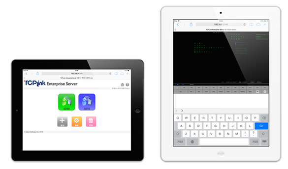 「TCPLink Enterprise Serverスマートデバイスオプション」では、メインフレームのオンライン端末機能をiPadやAndroid搭載タブレットなどのスマートデバイス上で実現できるもので、従来パソコンやハンディ端末で行っていたホスト業務を簡単に、場所にとらわれることなく行える。さらに、エミュレーション機能にはスマートデバイス上のWebブラウザを使用。専用アプリのインストールなどの手間が省かれ、管理負担の軽減も可能だ。