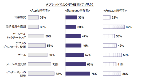 発表によると、米国のタブレット所有者のうち最も利用されているのiPadで43%、続いてAmazonのタブレット端末で24%、サムスンのタブレット端末が11%となった。また、それぞれのタブレット機種を保有しているユーザーに使用頻度を尋ねたところ、1日を通して使うと答えたのはAppleユーザーで32%。利用目的は「インターネットの閲覧」が最多だったが、Amazonのタブレット端末を利用しているユーザーは「読書」が最も多かった。Appleやサムスンのユーザーはインターネット閲覧やメールの送受信などでタブレットを日常的に使うのに対し、Amazonのタブレットを利用するユーザーは電子書籍を読むために使う傾向があると同社はコメントしている。