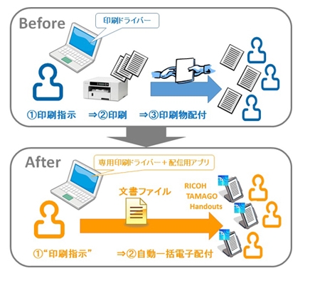 システムは、パソコンにインストールした印刷ドライバー「RICOH TAMAGO e-Distribution」と配信アプリ「RICOH TAMAGO PassIt」と、iPad/iPhoneにインストールした「RICOH TAMAGO Handouts」から構成される。