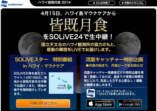 株式会社ウェザーニューズは11日、ハワイを始めアメリカから太平洋の一部で観測できる皆既月食について、24時間ライブ放送番組「SOLiVE24」で無料生中継すると発表した。
