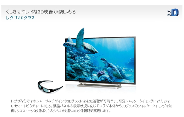 また、別売りのレグザ3DグラスFPT-AG02(J)と3DトランスミッターFPT-AGT1を用意すれば、3D視聴が可能になっている。