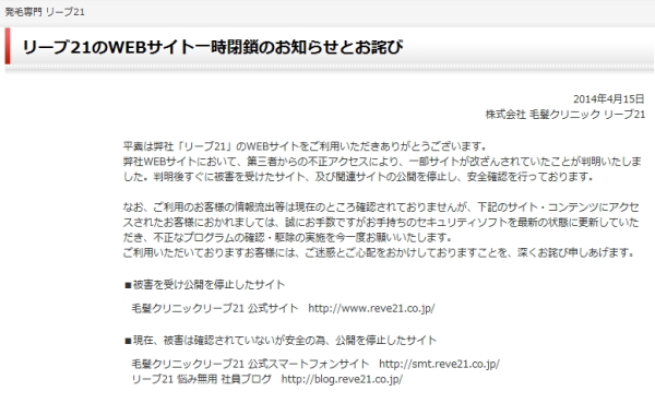 今回、被害が確認されたのは「毛髪クリニックリーブ21 公式サイト」(http://www.reve21.co.jp/)。また、安全のために公開を停止したサイトは「毛髪クリニックリーブ21 公式スマートフォンサイト」(http://smt.reve21.co.jp/)、「http://smt.reve21.co.jp/」(http://blog.reve21.co.jp/)。なお、「リーブ直販」(http://www.reve21shop.co.jp/)に関しては、不正アクセスされたサーバーとは別のサーバーで運営しているので、通常通り利用できるという。