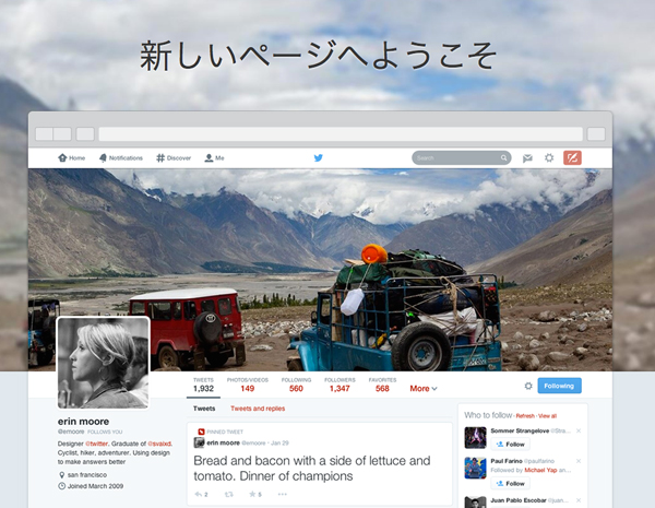 Twitterは、新しいプロフィールページを全ユーザーに向けて公開したと発表した。全ユーザーに段階的に新プロフィールページを公開していたが、まだページが移行していないユーザーは「新しいページへようこそ」から、新プロフィールページに移行することも可能だ。