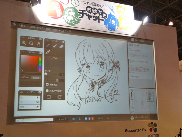 会場とオンラインで同時に参加できる「ニコニコ静画のお絵かきチャット supported by ワコム」では、全員でひとつのデジタル壁画を完成させる「超巨大デジタル壁画」のほか、ステージに出演するクリエイターにちなんだテーマに添ってお絵かきする「テーマで超お絵かき」が開催された。