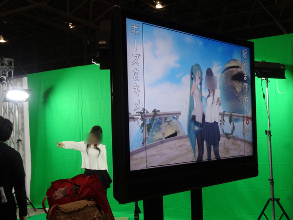 3DCG作品を手軽に制作できるツールとして人気の「MikuMikuDance(MMD)」を最新のAR技術を用いて、リアルの世界で体験する「超MMD写真館」では、3Dキャラクターとの2ショット写真を撮るために、大勢の来場者が列をなした。モーションキャプチャ装置を装着したスタッフが画面を見ながらポーズを取るため、キャラクターは自然な雰囲気で写真に写り込む。来場者自身も画面を見ながら、いろんなポーズを試していた。