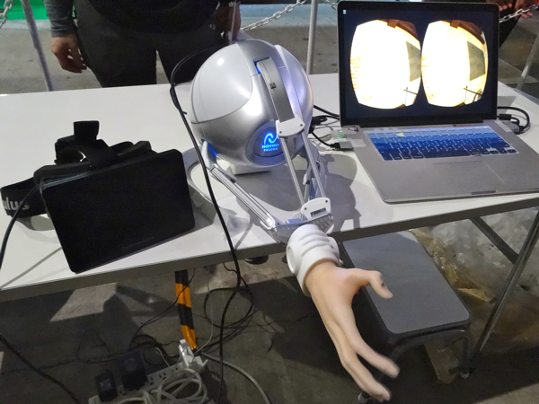 「超ボーカロイド感謝祭」の一角では「超ボカロキャラ握手会」が行われていた。これはVRシステム「OculusRift」と3次元感触インターフェイス「Novint Falcon」を組み合わせて独自につくられた「Miku Miku Akushu」によって、ボーカロイドキャラクターと握手できるというものだ。「Novint Falcon」は、通常ゲームなどで使用されるものだが、これに3Dプリンタでつくったシリコン製の手が装着されており、実際に握手しているような感覚を味わえるようになっている。画面内のキャラクターはこちらの手の動きに合わせて動く。筆者は初音ミクでトライしてみたのだが、上目遣いのミクさんにじっと見つめられて、ちょっと不思議な感覚を覚えた。