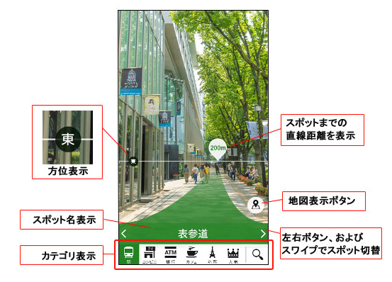 同機能は総合ナビゲーションアプリ「NAVITIME」と連携しており、現在地から1.5キロメートル以内のスポットを検索でき、目的地を設定すると端末のカメラで写している実際の風景上に、緑色の線で進む方向と目的地までの距離を表示する機能だ。docomo「AQUOS ZETA SH-04F」、docomo「AQUOS PAD SH-06F」、SoftBank「AQUOS Xx SoftBank 304SH」、au「AQUOS SERIE SHL25」の端末内のSHカメラアプリの撮影モード/撮影カメラ設定から「周辺ファインダー」を直接起動することが可能だ。また、シャープ製でAndroid OS 4.0以上の端末であれば「NAVITIME」アプリ内から起動することもできる。