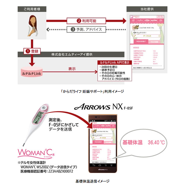 富士通株式会社は、「ルナルナ」を運営する株式会社エムティーアイよりAPIの提供を受け、女性をサポートするスマートフォン向け健康支援サービス「からだライフ 妊娠サポート」を開発、2014年5月30日(金)より提供すると発表した。
