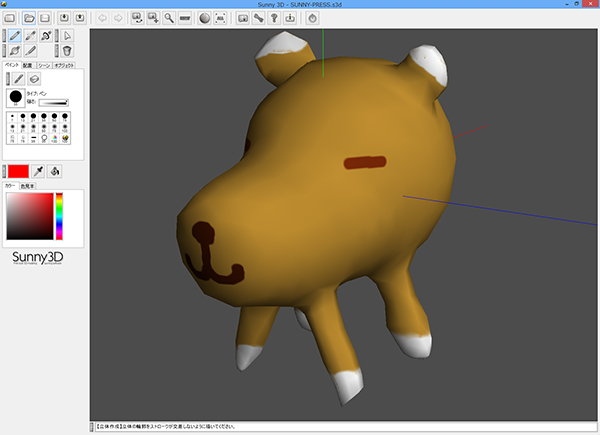 本ソフトは、専用ファイル形式のS3Dのほか、OBJファイルの入出力をサポート。データ書き出しのみ、SLTファイルにも対応している。輪郭線を描くだけで自動的に3Dモデルとして形状作成でき、描いた輪郭を引き伸ばして「押し出し形状」(掃引体)や、描いた輪郭を自動的に回転させて立体的な「回転形状」(回転体)を作成することも可能。変形/切り取りなどの編集機能も実装されている。3Dモデルへの着色も容易で、マッピング機能などに不慣れでも扱いやすく、そのまま表面に色を塗れる「ブラシ機能」を搭載。なお、本ソフトには、DMM.makeや24Studioの3Dプリントサービスで使用できる優待クーポンも同梱されている(Sunny 3Dの製品Webサイトから応募/有効期限2014年6月27日〜2016年6月30日)。