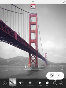 今回発表されたモバイルアプリのうち、「Photoshop Mix」ではiPad上での合成/マスキングなどの処理が可能。下方に操作ボタンが用意されており、ボタンの選択後にスライダ調整やプリセット選択によって各種編集を行える。編集は全て非破壊で行われ、やり直しや初期状態への復帰が可能だ。また、PSDファイルを開いて保存できる機能により、デスクトップ上のPhotoshop CCの高度な機能にアクセスして編集操作を行うことも可能。Photoshop CCとのシームレスな連携ワークフローを構築できる。