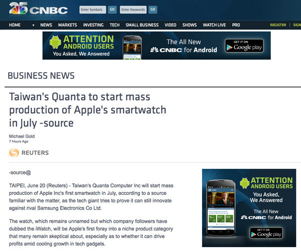 Appleのリストウォッチ型ウェアラブル端末「iWatch」の製造元である台湾Quantaが、早ければ7月から量産をスタートし10月に発売できるよう進めているとREUTERSが伝えている。
