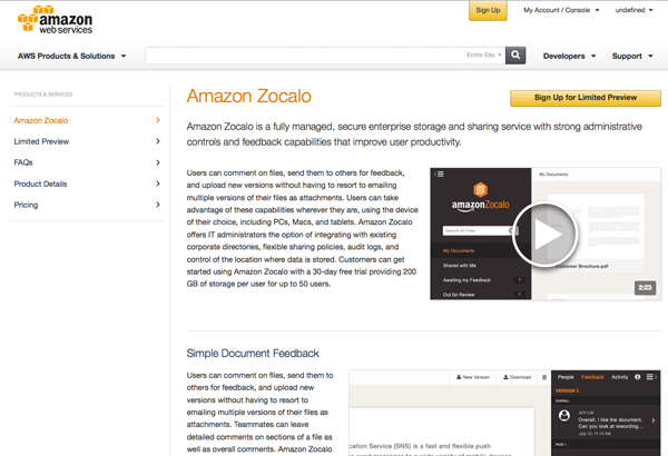 「Zocalo」は現在限定プレビュー版をリリースしており、申し込むことで利用が可能だ。クラウド上のストレージに保存した画像や文書などに、デスクトップPC、スマートフォン、タブレット、Kindle Fireなどからアクセスし、共有することが可能。また、Microsoftの「Active Directory」と統合することができるため、管理担当者は既存のシステムで「Zocalo」のユーザー管理が行える。