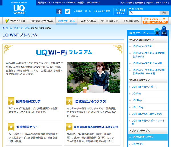 「UQ Wi-Fiプレミアム」ではUQ Wi-Fiエリアだけでなく株式会社ワイヤ・アンド・ワイヤレス(Wi2)が提供する国内多数の公衆無線LANエリアを利用することが可能だ。WiMAXと同様速度制限が無く高速サービスを容量無制限で利用できるほか、東海道新幹線内の車内Wi-Fiも利用できる。利用するには会員サポートページ「My UQ」から簡単な申込み手続きをするだけとなっている。