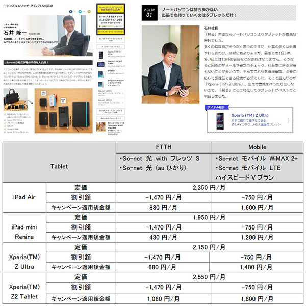 本サービスが対応している接続コースは、FTTHコース(So-net 光 with フレッツS、So-net 光/auひかり)とモバイルコース(So-net モバイル LTE ハイスピードVプラン、So-netモバイル WiMAX 2+)。契約期間中には、レンタルされる全端末に本体の保証サービスと電話でのテクニカルサービスが付帯されるなど、サポート面も充実している。また、本サービスの開始に合わせて、同社では専用のコンテンツページも公開。著名人のタブレット活用方法や、タブレットの面白い使い方などが紹介されている。