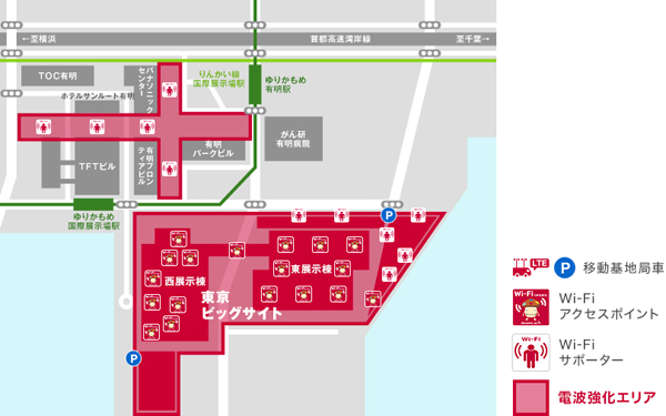 当日は会場および会場周辺をカバーしている基地局を増強するとともに、東京ビッグサイト敷地内にクアッドバンドLTE対応の移動基地局車を配備。また会場各所にWi-Fiサポーターも出動するという。対策日程は15・16日が4時30分~17時、17日が4時30分~16時となっている。