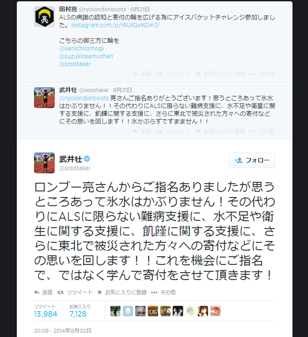 「ロンブー亮さんからご指名ありましたが思うところあって氷水はかぶりません!その代わりにALSに限らない難病支援に、水不足や衛生に関する支援に、飢饉に関する支援に、さらに東北で被災された方々への寄付などにその思いを回します!!これを機会にご指名で、ではなく学んで寄付をさせて頂きます!」(武井壮公式Twitterより引用)