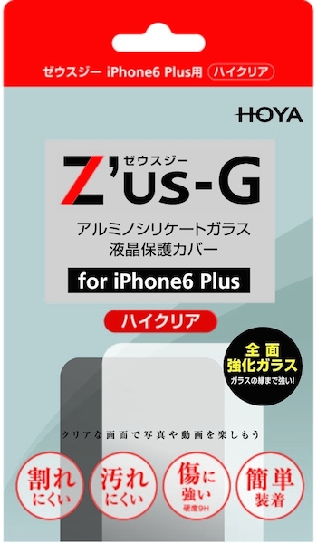 HOYAサービス株式会社は、iPhone6 Plus対応の強化ガラス製液晶保護フィルム「Z'us-G(ゼウスジー)」のハイクリア、ブルーライトカットを2014年10月17日に発売する。iPhone6対応版も同時発売する予定だ。