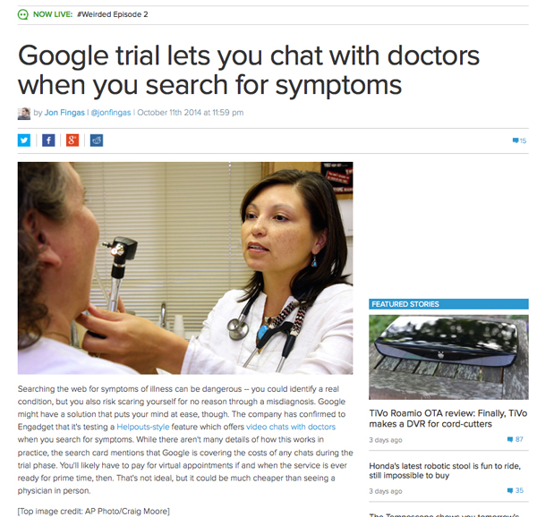 Googleがビデオチャットを通して医師に相談できるサービスをテスト中だと米Engadgetが報じている。ユーザーが自分の症状について検索している時に発見した機能で、SNS「Reddit」に投稿したという。