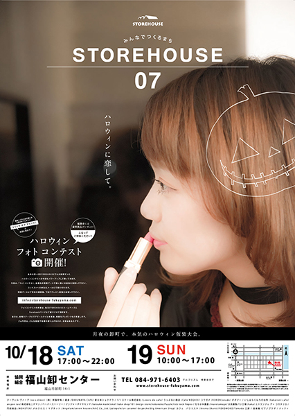 10月18日(土)〜19日(日)に福山卸センター敷地内(広島県福山市卸町14-1)にて、“月夜の卸町で本気でハロウィン”をテーマにした入場無料のまちづくりイベント「STOREHOUSE07」が開催。飲食/物販店舗の出店のほか、ハロウィンフォトコンテストも実施される。本コンテストでは、会場内特設ブースで撮影した“仮装”写真のメール応募が可能。後日Facebookなどで紹介され、グランプリを決める企画となっている。