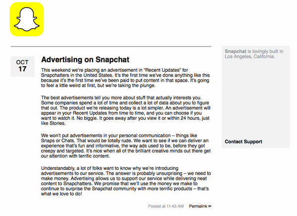 Snapchatは一定の時間でビデオメッセージが消滅するというビデオメッセージングアプリだ。配信されるアプリ内広告はユーザーの閲覧履歴といった、収集された情報に基づいたターゲティング型ではないとしている。Snapchatはブログにおいて「なぜこの広告を配信するのか。それはお金が必要だからです」として、集まった広告料はSnapchatをより良くするために使うとしている。