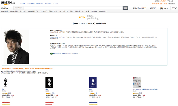 Amazon.co.jpは、主に著書の販売やカスタマーレビューにおいて最も成功をおさめたKindleダイレクト・パブリッシング(KDP)の著者に対して授与する「KDPアワード」を創設し初の受賞者となる「AUTHOR OF THE YEAR 2014」に高城 剛氏が選ばれたと発表した。