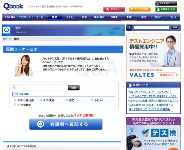 バルテス株式会社は13日、ソフトウェア開発の現場における「テスト」や「品質」の悩み・問題を書き込むと、それぞれに精通した有識者が回答してくれるコーナーを、テスト・品質の情報発信サイト「Qbook」に新設したと発表した。