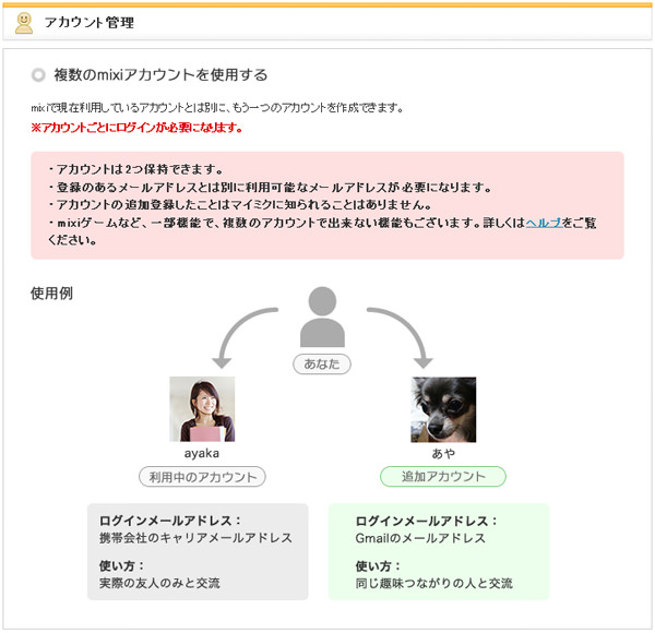 同機能は、自分のmixiアカウントに新しいアカウントを追加できる機能。アカウントの追加によってユーザーはmixiアカウントを2つ保有することが可能となる。今回の試験提供では、PCとスマートフォンのブラウザ機能で提供を開始し、スマホアプリでの提供も順次対応する。正式提供は2015年3月頃を予定しており、ログアウトせずにアカウントを切り替えられる「アカウント切り替え機能」の提供も予定している。