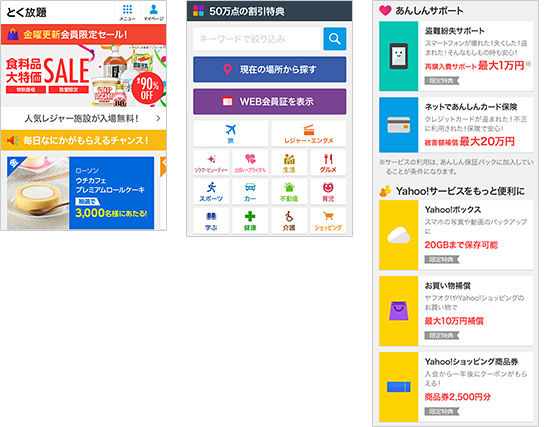 また、スマートフォンの盗難や紛失時に再購入費が最大1万円割引となる「盗難紛失サポート」や、ネットショッピングで詐欺などの被害を受けた場合に最大20万円を補償する「ネットであんしんカード保険」を利用できるほか、Yahoo!ショッピングやYahoo!ボックス向けの特典も利用できる。