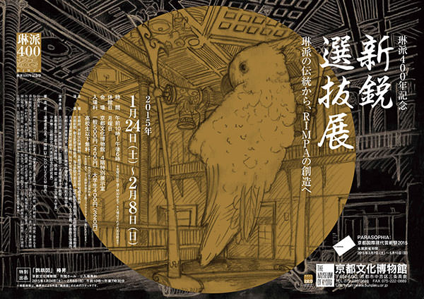 京都府/京都府京都文化博物館/京都国際現代芸術祭組織委員会の主催により、「京都国際現代芸術祭2015」プレ事業として、1月24日(土)より開始する展覧会。京都府では2000年度から新進作家の創作活動を紹介する選抜展を実施しており、本年度は琳派が誕生した1615年から400年を数えることを記念して開催される。月曜休館、時間は10:00〜18:00(金曜は19:30まで/入場はそれぞれ30分前まで)で、入場料は一般500円/大学生400円/高校生以下無料。