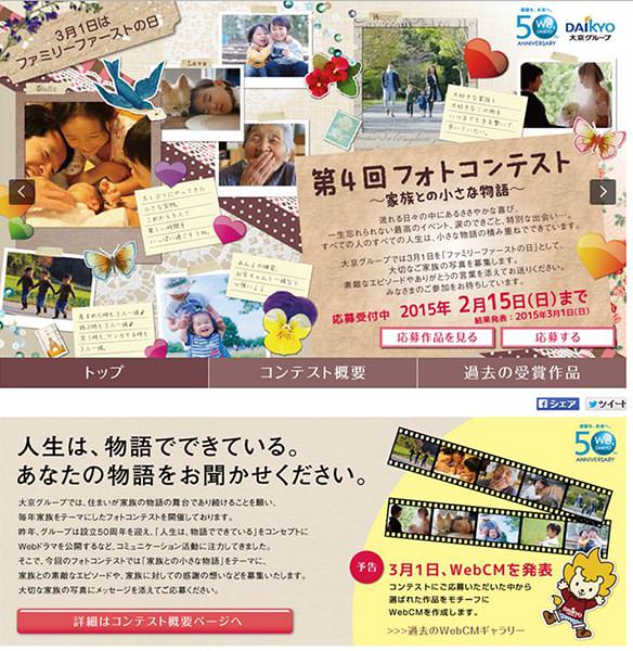 株式会社大京を中心とする大京グループが、3月1日「ファミリーファーストの日」に向けて開催中の企画。大京グループは昨年に設立50周年を迎え、「人生は、物語でできている」をコンセプトにWebドラマを制作/公開するなど、コミュニケーション活動を展開している。本コンテストでは「家族との小さな物語」をテーマに、家族との素敵なエピソードや、家族に対する感謝の想いなどを、写真(デジタルデータ)とメッセージで募集中。撮影時期は不問、画像形式はJPEG/TIFF/BMPで、応募点数は1人につき10点まで。