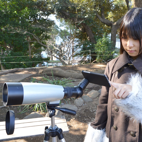 同製品は、iPhoneに取り付けられる45倍の望遠鏡。iPhoneを専用ケースに入れて、スポッティングスコープに取り付けることにより、iPhoneを望遠鏡のビューモニターとして利用可能で、望遠鏡で拡大された映像を複数の人と一緒に見たり、撮影したりすることができる。望遠鏡のサイズは85(幅)×85(高さ)×345(奥行き)mm、重量は575g。付属の三脚は90(幅)×425〜1290(高さ)×80(奥行き)mm、重量は584g。
