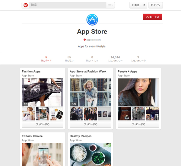 というのは、ピンした情報をたどって、実際になんらかの製品の購入に至るユーザーが多いこともPinterestの大きな特徴で、購買力が高く個性的なファッションを求める女性消費者などに強く支持されているためだ。実際に、Apple(正確にはApp Store)の公式Pinterestアカウント(https://www.pinterest.com/appstore/)でも、ファッション系やヘルシーなレシピ系のiOSアプリが強く勧められており、まずはターゲットを絞ったマーケティングツールとしてPinterestを活用しようとする意図が見て取れる。