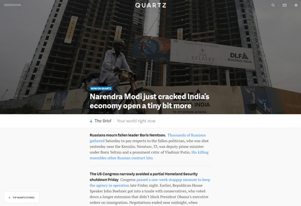 Quartzの特徴は、英字にして500文字以下の短文と、800文字以上の長文をミックスして配信する手法にある。オートページングによってスクロールのみで次から次へと記事を読ませる、モバイルに最適化したデザインもすばらしい。時々、記事間にネイティブアドを混ぜるやり方も見事である。