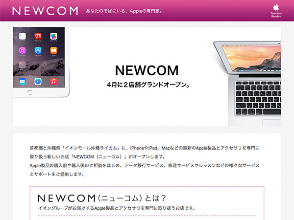 イオンリテール株式会社は、Appleの正規代理店であるApple Premium Reseller「NEWCOM(ニューコム)」の出店を開始することを発表した。2015年4月に、首都圏に1号店/イオンモール沖縄ライカムに2号店を出店し、その後も順次に多店舗を展開する予定。専任スタッフが接客を担当し、製品の購入前/購入後の相談をはじめ、設定/データ移行/修理まで一貫したサービスを提供する。
