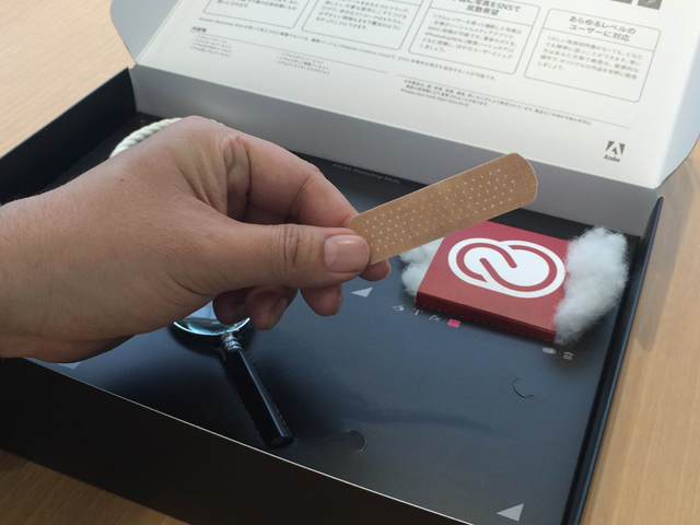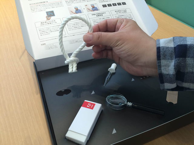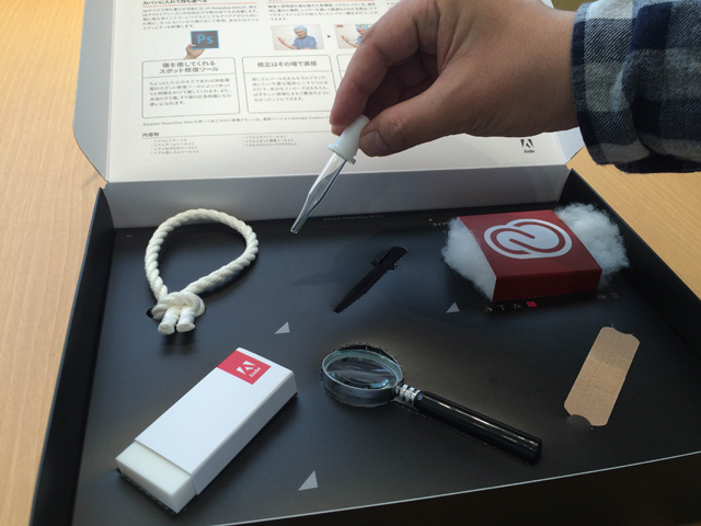 そして、次に取り出したのはリアル消しゴムツール。長時間のレビューに段々と飽きてきた頃なので、勝手にお絵かきをはじめる。仕事で使う資料にマジックで落書きした後、リアル消しゴムツールで消そうとしてみたが、油性ペンであったため、敢え無く撃沈。こちらはオンライン編集ツールの消しゴムツールの方に軍配があがった。ちなみにリアル消しゴムツールにあるロゴをよく見ると「Adobe」ではなく「Asobe」になっていた。こんなところにも遊び心を取り入れている。