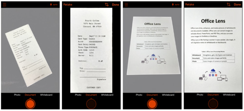 「Office Lens」は、スマートフォンのカメラで撮影した領収書、名刺、メニュー、ホワイトボードや付箋などの画像をクラウド上に保存できる。カメラが傾いていたりパースがついたりしていても、文書の角を認識して自動的にトリミングし、文書が読めるよう鮮明な画像に整えてくれる。