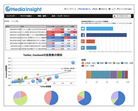 記事分析ツール「Media Insight」は、ニュース記事がソーシャルメディアでどのぐらい反響があるのかを調査、実際に記事がどう読まれているかを分析することができる。競合媒体のモニタリング機能、チャネル別効果測定、記事コンテンツ分析などが大きな特徴となっている。