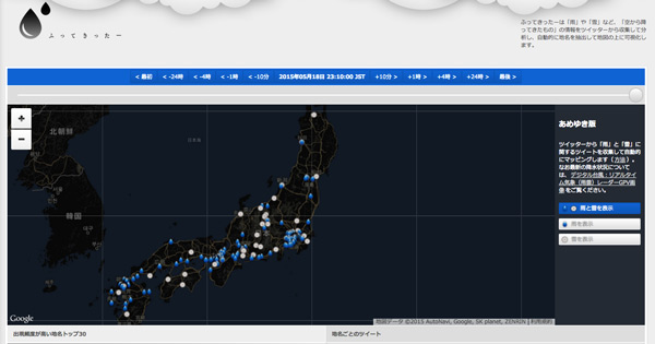雨や雪、雷などの気象状況に関するツイートを自動収集して地図上に表示させ、現在の天気状況を可視化するインフォグラフィック。たとえば、「あめゆき版」のマップ上で雨粒のアイコンをクリックすると、その地点のツイートを閲覧することができる。地図から最新の気象レーダー画像(エコー強度)の表示に切り替えることもでき、リアルタイムなスポット情報を知りたい時に役立ちそうだ。